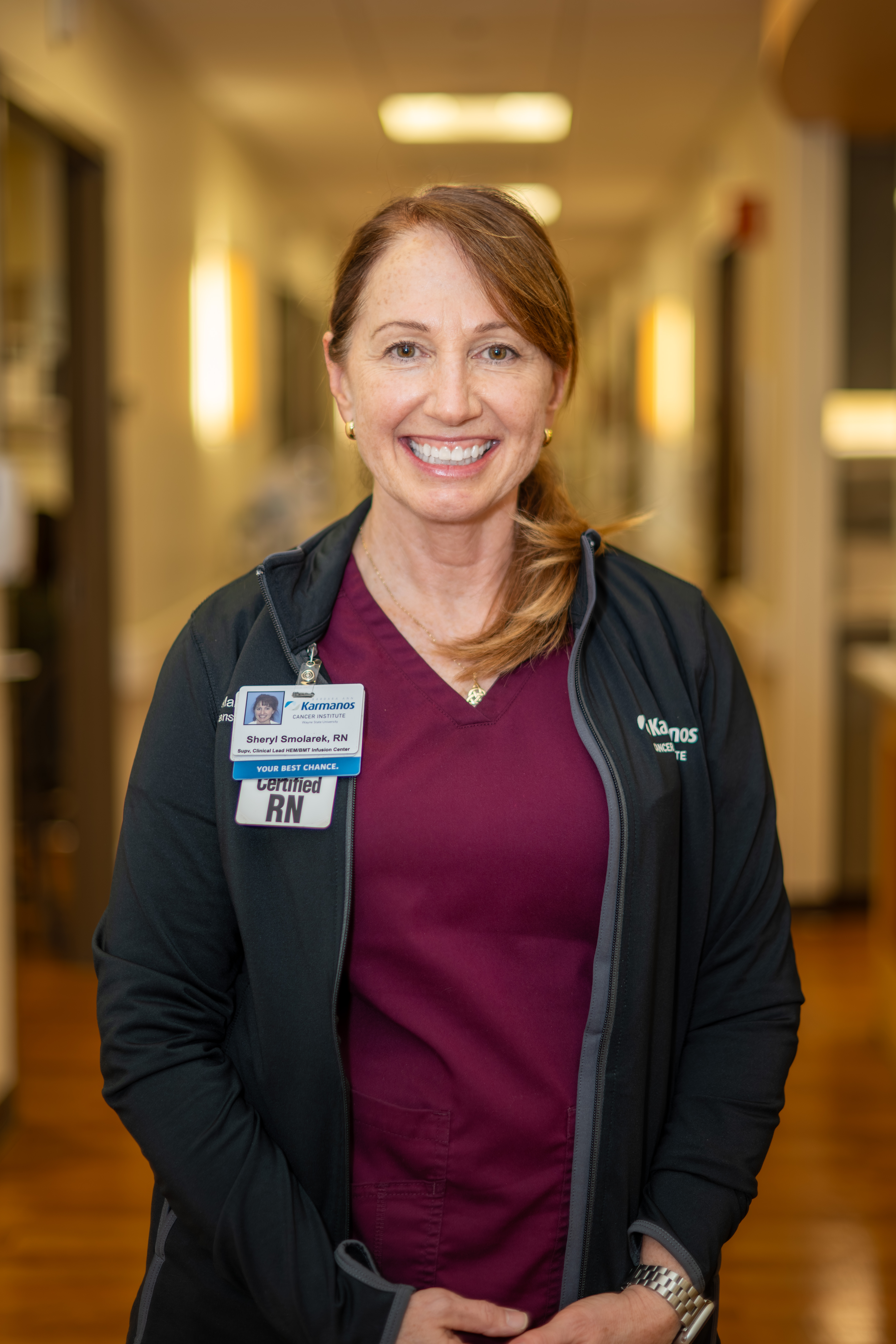 A Karmanos Cancer Institute nurse is named a finalist for the 2025 Hour Detroit Nurse of the Year Award. Sheryl Smolarek, BSN, RN, OCN, is the supervisor and clinical leader of the hematology and bone marrow transplant infusion center, known as the Dresner Infusion Center. In her nomination, Smolarek’s manager said that she, “is more than a leader to staff and more than just a supportive nurse to patients. She is well-respected for her knowledge and expertise in oncology nursing, specifically related to chemotherapy and transplantation.”